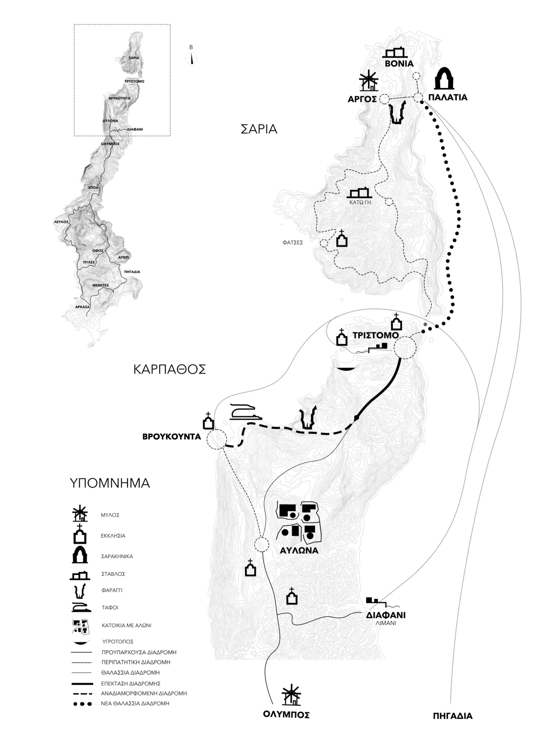 Η πρόταση προτείνει την ανάδειξη και ενεργοποίηση του βόρειου τμήματος της Καρπάθου μέσα από ένα δίκτυο πεζοπορικών και θαλάσσιων διαδρομών που συνδέει τέσσερα κομβικά σημεία: την Αυλώνα, τη Βρουκούντα, το Τρίστομο και τη Σαρία.