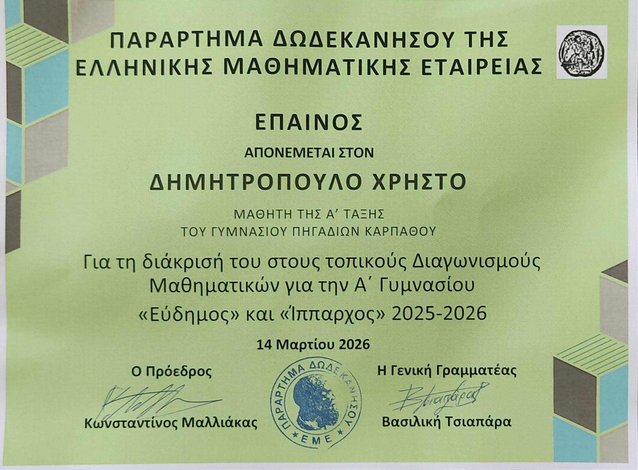 Ανάμεσα στους μαθητές που ξεχώρισαν ήταν και ο Χρήστος Δημητρόπουλος, μαθητής της Α΄ Γυμνασίου, Πηγαδίων Καρπάθου ο οποίος κατάφερε να διακριθεί στον διαγωνισμό και να προκριθεί στην επόμενη φάση, αποσπώντας έπαινο για την επίδοση του.