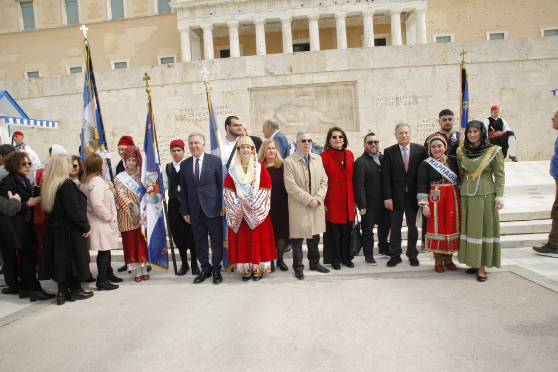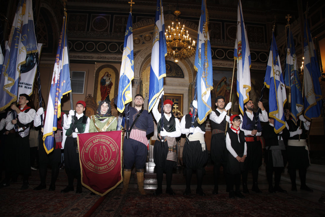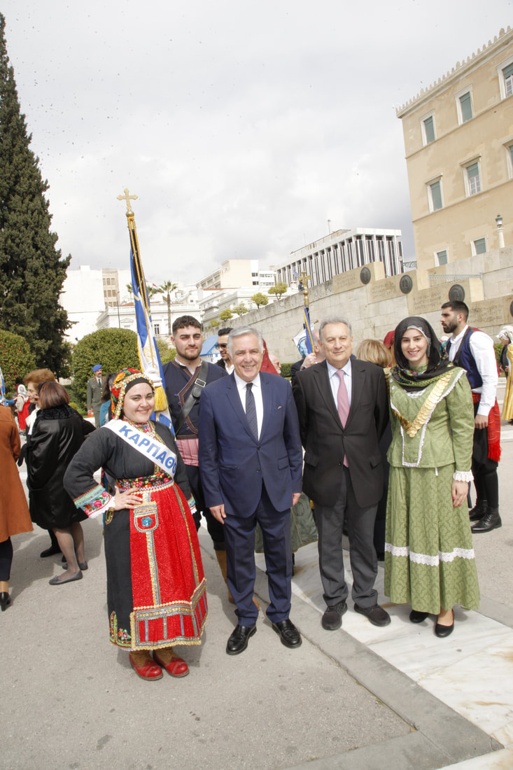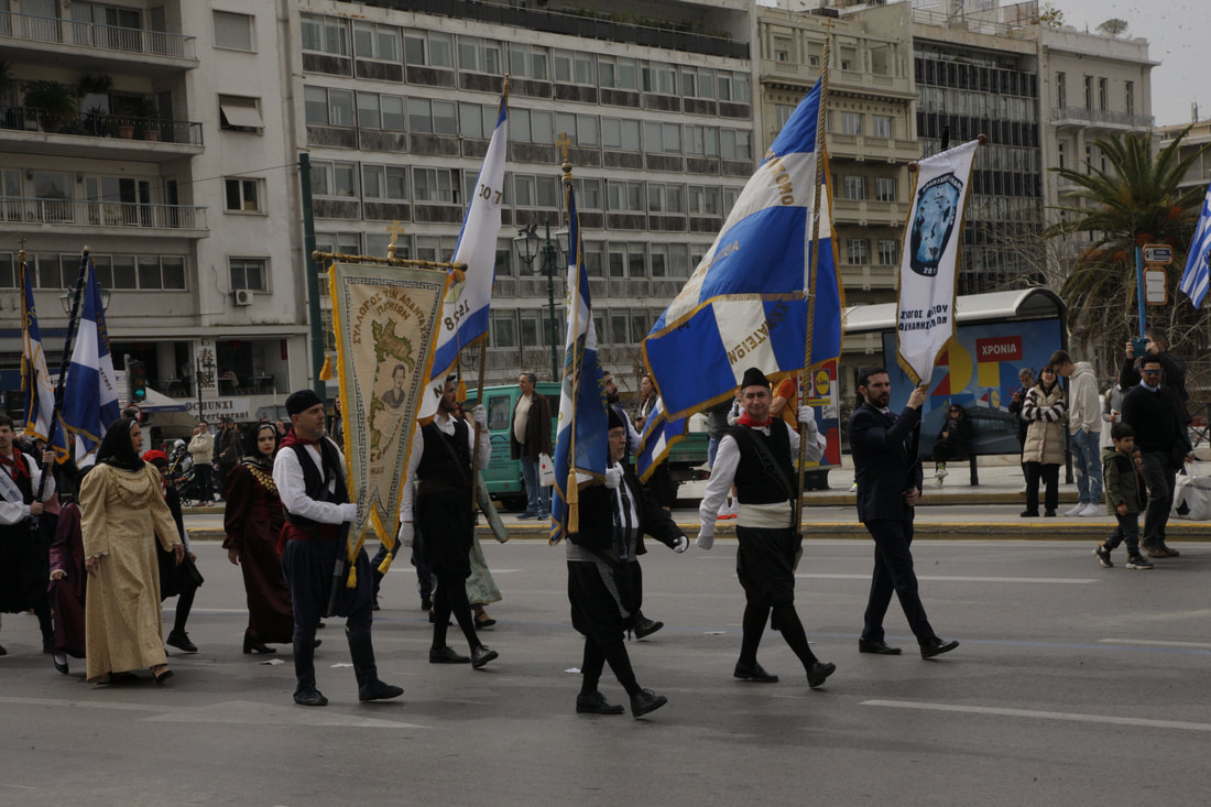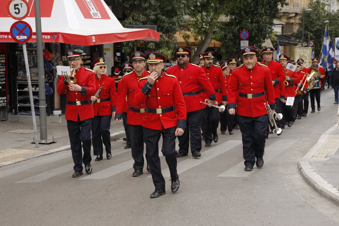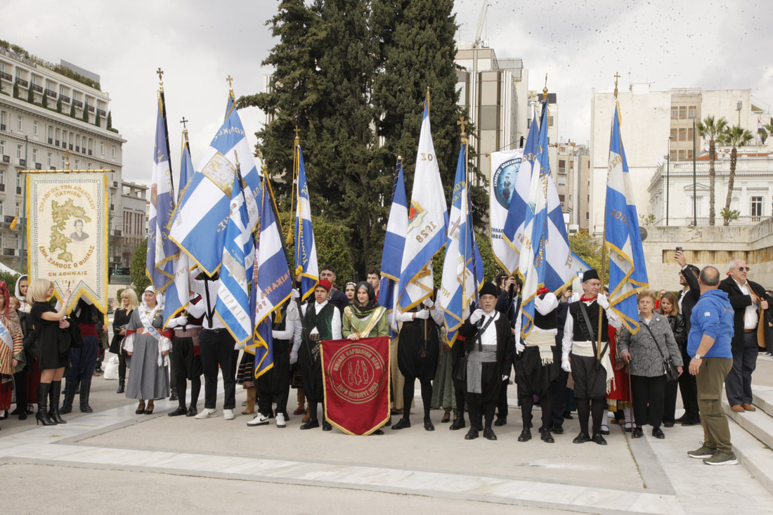 Ακολούθησε η καθιερωμένη πομπή με την συνοδεία της Φιλαρμονικής Κώων Πολιτιστικού Συλλόγου «Παναγιώτης Τσακανιάς», από τον Καθεδρικό Ναό Αθηνών μέχρι το Μνημείο του Αγνώστου Στρατιώτη στο Σύνταγμα, όπου η Προεδρική φρουρά έφερε τη στολή του Βρακοφόρου του Αιγαίου Αρχιπελάγους. Η πομπή έκανε μια στάση για προσευχή στο σημείο αναγραφής των 57 θυμάτων της τραγωδίας των Τεμπών.