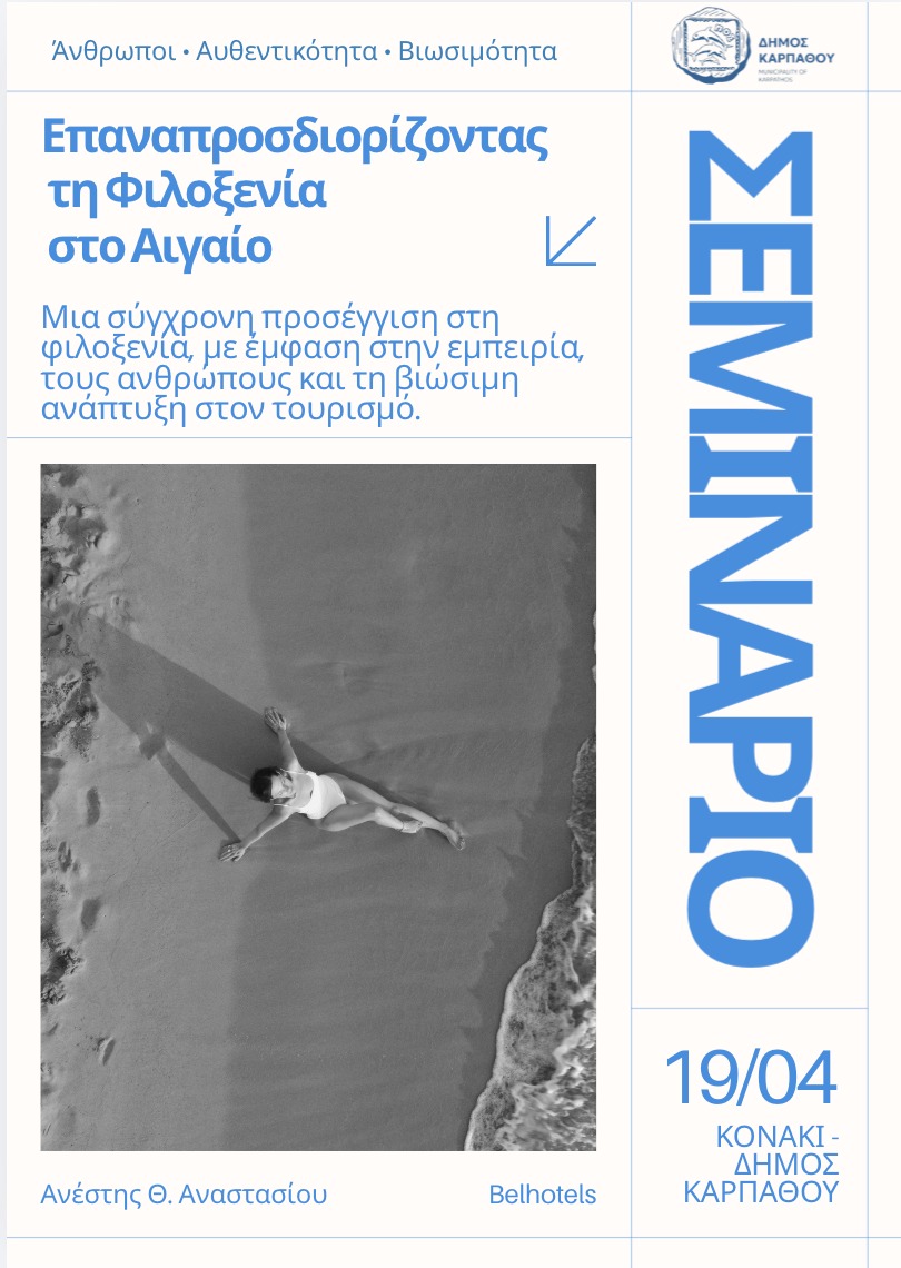 Ο Δήμος Καρπάθου σε συνεργασία με την Belhotels σας προσκαλεί σε ένα εξειδικευμένο σεμινάριο για τον σύγχρονο τουρισμό και τη φιλοξενία. 19 Απριλίου στο Κονάκι, 6-8μμ.